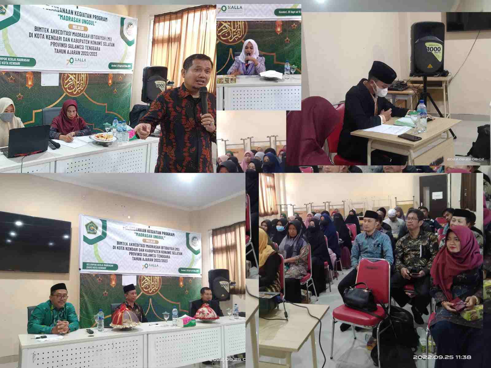 Kendari, (Humas Sultra) — Pelaksanaan Kegiatan Program Madrasah Unggul Melalui Bimtek Akreditasi Madrasah Ibtidaiyah (MI) di Kota Kendari dan kabupaten Konawe Selatan Provinsi Sulawesi Tenggara Tahun Ajaran 2022/2023 pembukaan untuk pelatihan I dilaksanakan di Aula Ma’had MTsN 1 Kendari pada hari Senin, 25 September (25/09/2022).