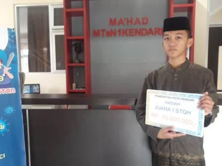 Kendari,(MTsN1) — Salah satu santri ma’had Thalabul Ilmi Madrasah Tsanawiyah Negeri (MTsN) 1 Kendari, Muhammad NurAlim meraih juara 1 bidang hafalan alquran golongan 5 juz dan tilawah,pada ajang Seleksi Tilawatil Quran dan Hadist(STQH) tingkat kota Kendari pada beberapa waktu lalu .Nuralim akan menjadi utusan kota Kendari pada STQH tingkat provinsi pada bulan April 2021 mendatang yang akan diselenggarakan di kota Kendari.